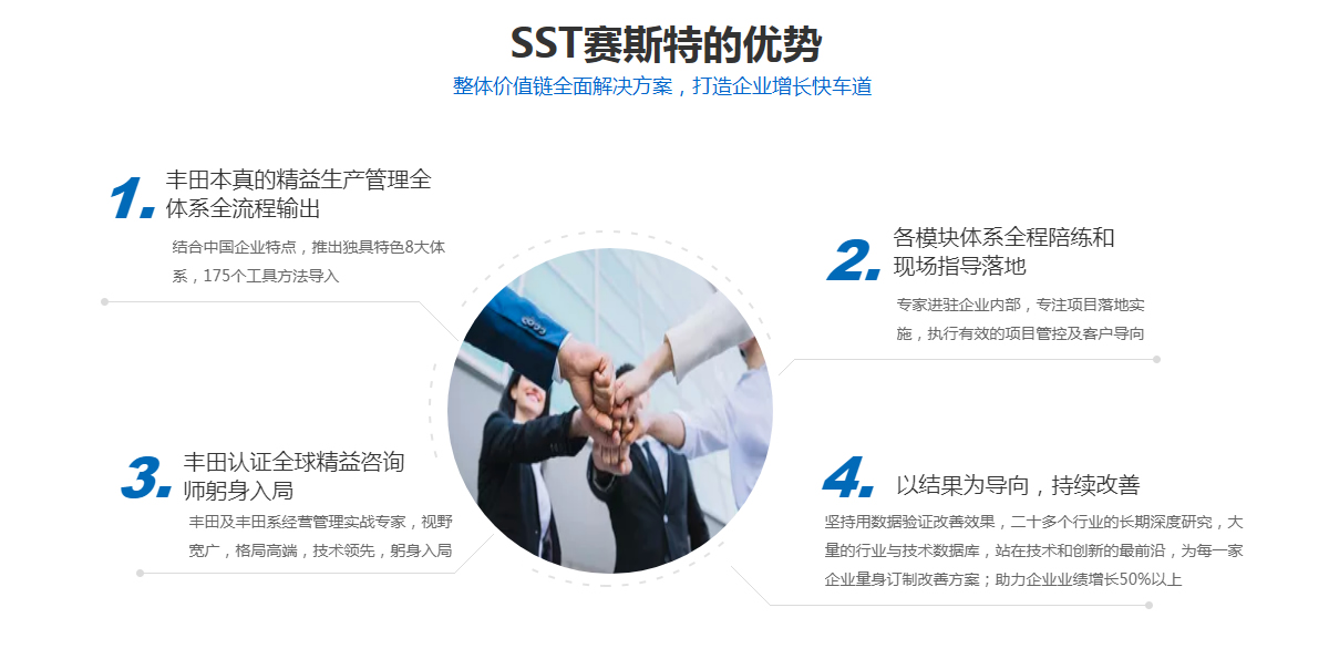 賽斯特集團(tuán)(SST)是豐田為背景的一家致力于企業(yè)管理咨詢、培訓(xùn)服務(wù)為主的國際化管理咨詢機(jī)構(gòu),依托于精益發(fā)源地豐田公司為背景的專家團(tuán)隊(duì),專業(yè)從事精益生產(chǎn)培訓(xùn)和咨詢服務(wù)的管理咨詢機(jī)構(gòu),中國本土唯一一家融合日本豐田,北京現(xiàn)代,韓國三星等專家為一體的咨詢機(jī)構(gòu)。旗下?lián)碛校禾旖蛸愃固仄髽I(yè)管理咨詢公司,天津眾益天成管理咨詢公司,北京冠群精益管理咨詢公司,天津精益智能咨詢有限公司等四家分支機(jī)構(gòu)。
